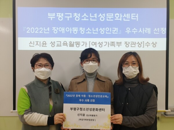 이정호 부평구 청소년성문화센터장은 “이번 수상을 계기로 쉽게 이해하고 실천할 수 있는 다양한 교육을 기획해 장애 아동·청소년의 성적권리 보장에 앞장서겠다”고 말했다.