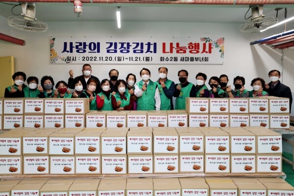 지난 20일과 21일 이틀간 진행된 행사에는 화수2동 새마을부녀회원 15명이 참여, 직접 김치를 담가 홀몸 어르신과 장애인 등 저소득계층 70세대에 전달했다.