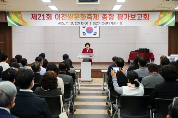종합 평가보고회에 참석한 김경희 이천시장은 “뜨거운 성원 속에서 대한민국 최우수축제로서의 위상을 다시 한 번 확인할 수 있었다”며 “주차공간을 비롯한 많은 아쉬움을 개선하기 위해 다각적인 검토를 진행하고 있으며 향후 국내·외 모두가 다함께 즐길 수 있는 관광 축제로 자리매김 할 수 있도록 발전적 방향을 모색하고 있다”며 이천쌀문화축제의 비전을 제시했다.
