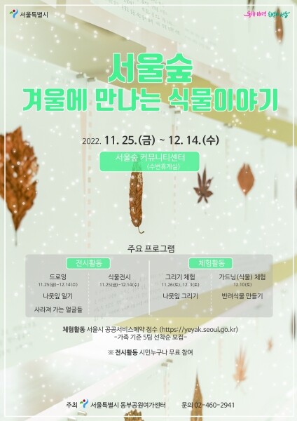 장소는 서울숲 커뮤니티센터 1층 전시관 내부 체험존에서 진행되며 자세한 문의는 서울시 동부공원여가센터로 하면 된다.
