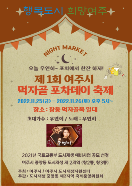 축제 첫날인 25일에는 주민자치회 공연 및 경품행사와 오후 5시부터 24시까지 운영되는 포장마차 콘셉트의 먹거리 부스가 운영되고 둘째 날인 26일에는 초대 가수 우연이 등 축하공연 행사와 폐막식이 진행되며 마지막 날의 포차 먹거리 부스는 22시에 운영이 종료될 예정이다.