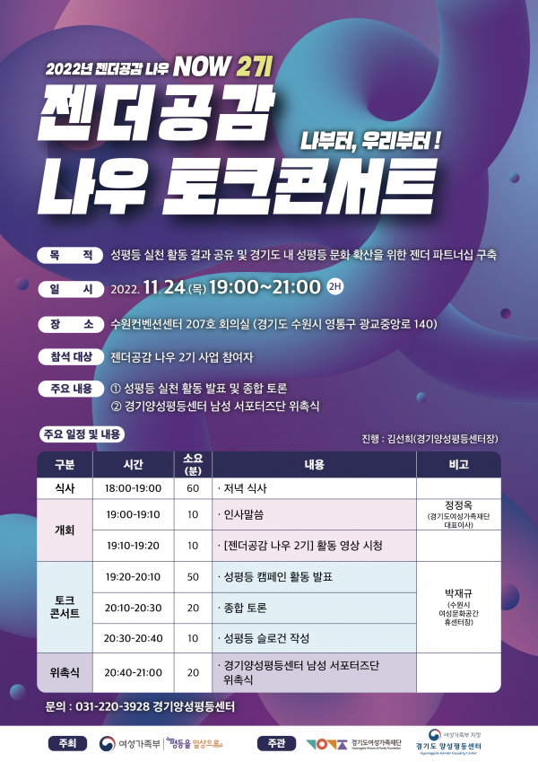 이날 행사는 정정옥 경기도여성가족재단 대표이사의 인사말을 시작으로 젠더공감 나우 2기생들이 팀별, 개별 캠페인 활동 후기를 발표한다.
