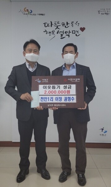 이에 이범주 설악면장은 “이장 활동에 최선을 다하며 나눔문화 확산에도 늘 관심을 갖고 꾸준히 성금 기탁을 해주신 권형수 이장께 감사드린다 어려운 이웃에게 이장님의 따뜻한 마음이 잘 전달되도록 하겠다”고 전했다.