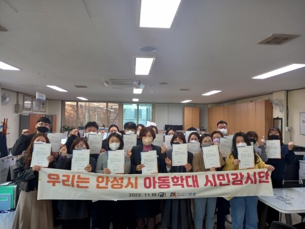 이에 시는 지난 8일 체벌 없는 양육문화 조성 및 적극적인 신고의무에 대한 사회적 인식 제고를 위해 32개소 아동복지시설 종사자를 대상으로 ‘맞춤형 아동학대 예방 교육 및 시민감시단 서약서 쓰기 캠페인’을 진행했으며 14일부터는 15개 읍면동과 안성시청 3층 카페에서 ‘긍정 양육 129 홍보지 배포 및 아동학대 시민감시단 서약서 쓰기 캠페인’을 안성시민과 市 공직자를 대상으로 실시하고 있다.
