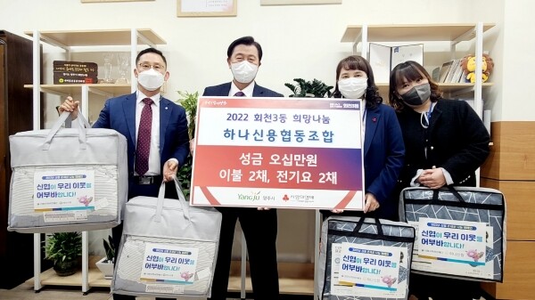 금숙 회천3동장은 “지속적인 나눔을 실천하는 하나신협 모든 임직원분께 감사드린다”며 “앞으로도 취약계층에 꾸준한 지원이 이어질 수 있도록 최선을 다하겠다”고 말했다.