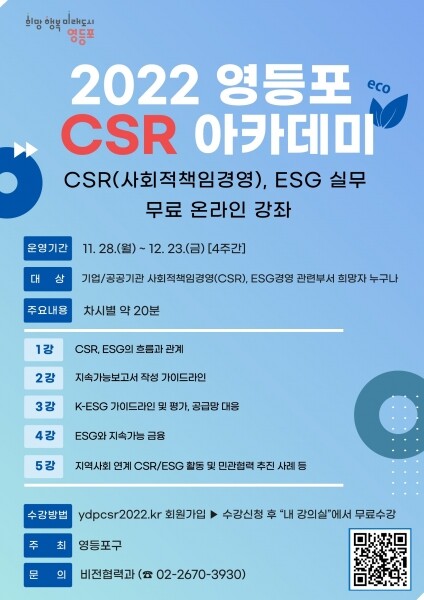 11월 28일 오픈되는 ‘2022 영등포 CSR 아카데미 홈페이지’에 회원가입 후 강좌를 들을 수 있으며 각종 질의를 하거나 수료증 발급도 가능하다.