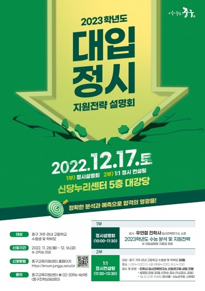 김길성 구청장은 “중구는 입시 설명회뿐만 다양한 교육 컨텐츠를 제공해 학생과 학부모님들에게 사교육 못지않은 양질의 도움을 드리겠다”며 “수험생 여러분 고생하셨다 좋은 결과 있으시기를 기원한다’고 전했다.