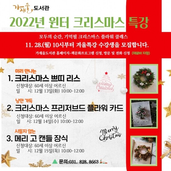 의정부가재울도서관 2022년 윈터 크리스마스 특강의 수강 신청은 11월 28일 월요일 오전 10시부터 가재울도서관의 홈페이지로 신청하거나 전화로 접수할 수 있으며 참가비는 무료이다.