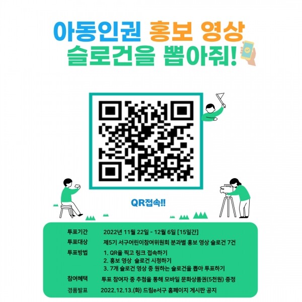서구 관계자는 “투표에 참여하면 ‘아동권리옹호 캠페인’에도 자연스레 동참할 수 있다”며 “구민분들이 제5기 어린이참여위원회의 창의력이 돋보이는 캠페인 슬로건 영상을 많이 시청하고 온라인 투표에도 적극적으로 참여해 주셨으면 한다”고 밝혔다.