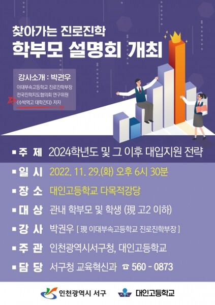 대인고에서 열릴 3번째 설명회는 전국진학지도협의회 연구위원이자 ‘수박먹고 대학간다’의 저자인 박권우 강사가 초빙돼 강의를 진행한다.