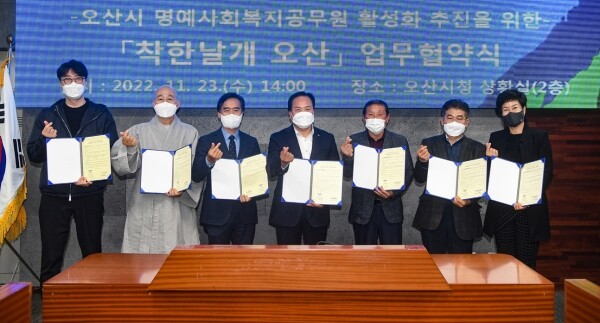 협약식에는 오산시기독교총연합회, 오산시불교사암연합회, 오산시의사회, 한국세탁업중앙회 오산시지부, 한국공인중개사협회 오산시지회, 축산기업중앙회 오산시지부, 한국떡류식품임가공협회 오산시지부 대표가 참여했다.