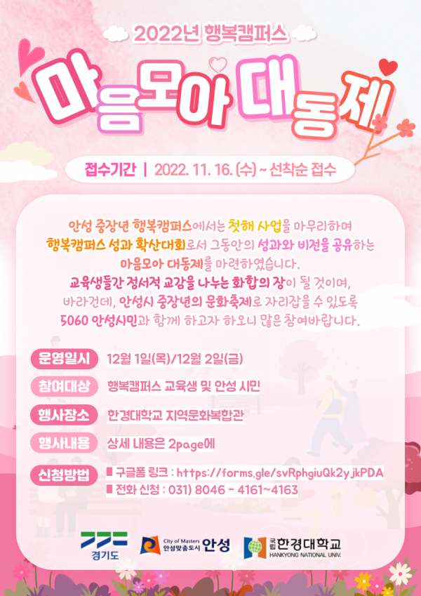 또한 12월 2일 ‘마음모아 대동제 2일차’에서는 올해 첫걸음을 내디뎠던 ‘안성 중장년 행복캠퍼스’ 사업의 성과가 영상과 전시로 정리된다.