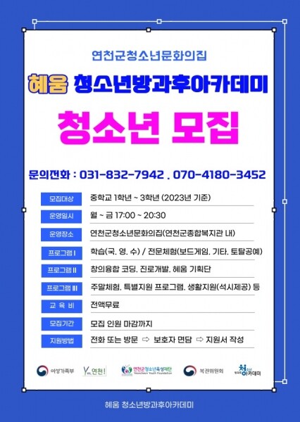 교육비는 전액무료로 석식제공 및 생활지원 등 방과후 청소년들에게 양질의 서비스가 제공되며 참가 신청은 연천군청소년문화의집에 문의해 신청서를 작성·제출하면 된다.