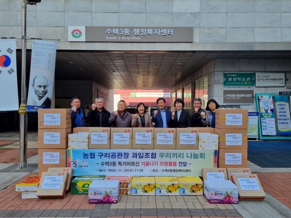 농협구리공판장 과일조합 우리끼리나눔회는 조합원 상인들이 설립한 봉사단체로 지난 7월부터 관내 중장년 1인가구에게 밑반찬, 생필품 등을 제공하는 “정♡나눔마켓”에 주 1회 신선한 제철과일을 후원하는 등 어려운 이웃을 위한 나눔을 꾸준히 실천해오고 있다.