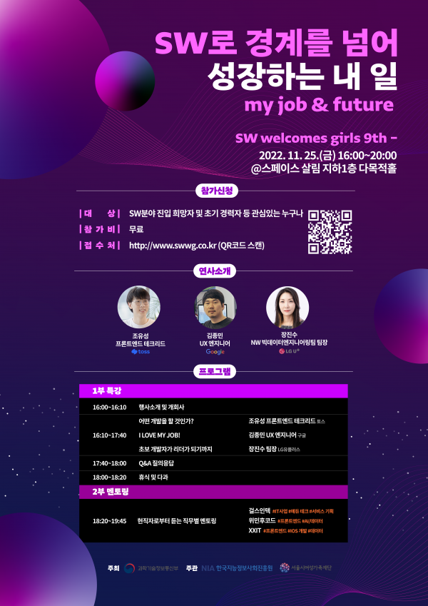 올해는 ‘소프트웨어로 경계를 넘어 성장하는 내일’이라는 주제로 1부 소프트웨어 분야 실무자들의 경력 관리와 학습 노하우 특강과 2부 여성 테크 커뮤니티의 학습 멘토링을 통해 커리어 개발 조언을 듣는 시간이 이어진다.