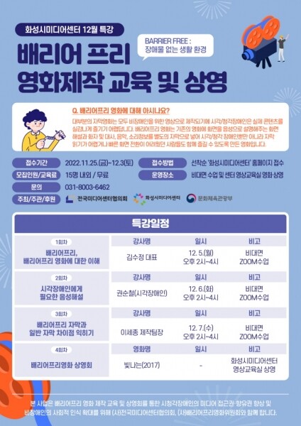 이어지는 배리어프리영화 상영회는 화성시미디어센터 영상교육실에서 오는 12월 10일 10시에 진행된다.