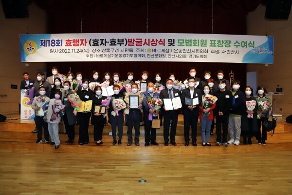 영예의 수상대상은 공경상 천점수 섬김상 권민영 화목상 강효정 효행상 홍진희·김원남씨가 선정됐으며 지역사회를 위해 노력해온 바르게살기운동 안산시협의회 모범회원 29명에게도 표창장이 수여됐다.
