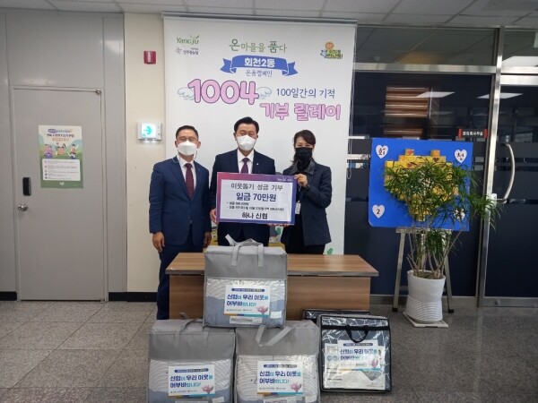 홍미영 회천2동장은 “어려운 경제상황에도 지역 내 소외된 이웃을 위해 기부에 참여해 주신 하나신협 김중열 이사장님과 임직원 여러분께 감사드린다”며 “나눠주신 소중한 온정은 관내 어려운 이웃을 위해 소중히 쓰겠다고 밝혔다”고 감사의 인사를 전했다.