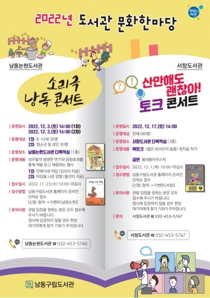 문화 행사는 누구나 무료로 참여할 수 있으며 남동구립도서관 홈페이지에서 신청할 수 있다.