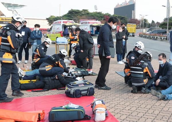이번 훈련은 미추홀구청, 미추홀소방서 신세계야구단 3개 기관이 협업해 지진으로 인한 문학경기장 건물붕괴 및 가스누출 화재 발생을 가상한 복합재난사고 대응 현장훈련으로 진행했다.