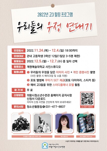 고3 힐링 프로그램 ‘우리들의 우정연대기’는 수능이 끝난 관내 고 3 청소년을 대상으로 친구들과 우정을 담을 수 있는 이미지 사진 촬영과 개인 증명사진 촬영이 진행되며 촬영된 사진으로 포토 다이어리를 꾸밀 수 있는 포토북 다이어리 STE를 제공한다.