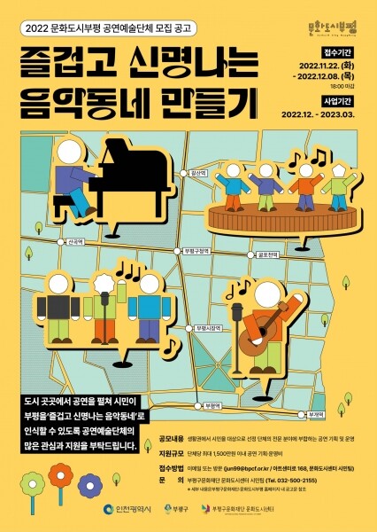 선정된 단체는 내년 1월부터 3월까지 부평구의 야외·내부 등 개방된 장소에서 최소 3회 이상 공연을 진행해야 한다.