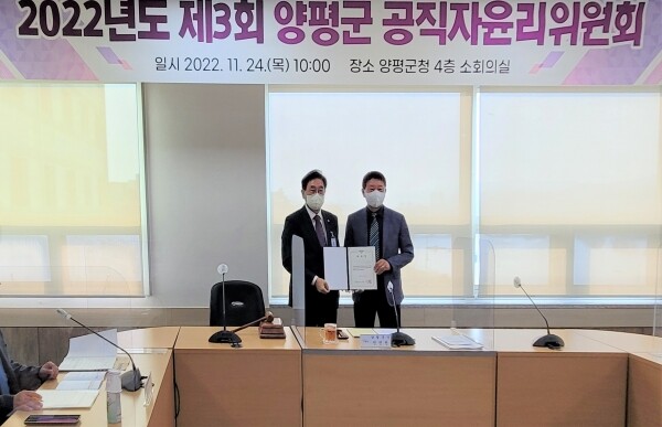 전진선 양평군수는 “양평군공직자윤리위원회가 양평군의 공직윤리 정착을 위해 노력하는 것을 잘 안다”며 “앞으로도 위원회의 중요한 역할과 기능에 맞춰 최선을 다해 주길 바란다”고 말했다.