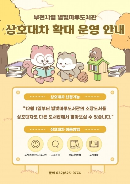 상호대차 서비스를 신청하기 위해서는 부천시립도서관 회원으로 가입되어 있어야 하며 1인 5권까지 신청할 수 있다.