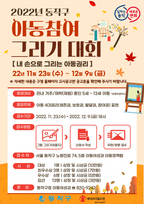 관내 거주 또는 재학 중인 5~13세를 대상으로 하며 8절 도화지 규격 작품과 제출 서류를 기간 내 동작구청 아동여성과로 우편 또는 방문 제출하면 된다.