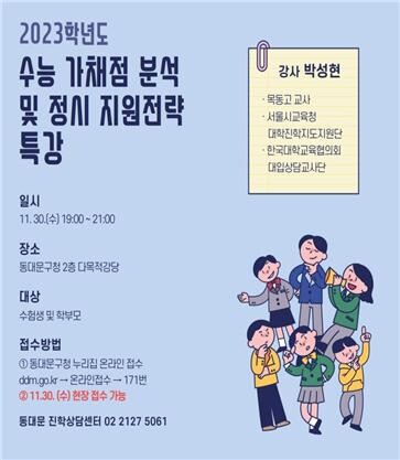 또한, 동대문구진학상담센터에서는 12월 30일까지 2023학년도 대입 개인별 1:1 맞춤형 집중 컨설팅도 실시한다.
