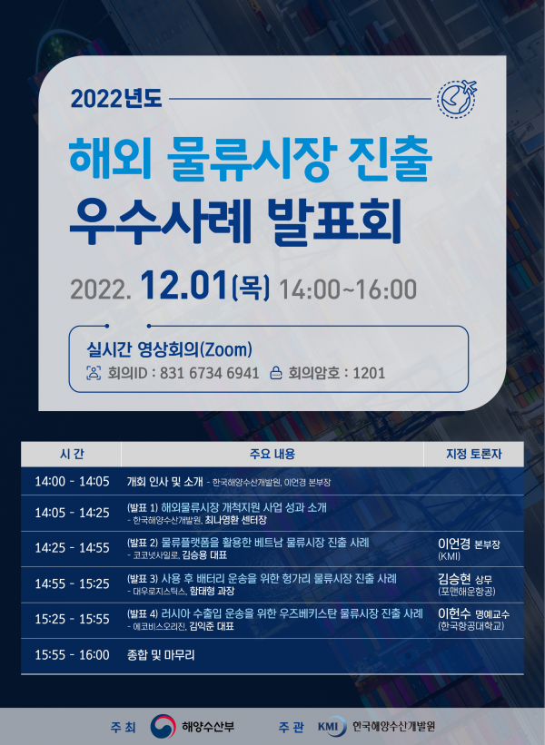 올해 발표회에는 해양수산부와 한국해양수산개발원, 그리고 지원 사업을 통해 해외로 진출한 우리 물류기업 등이 참석할 예정이며 특히 베트남, 헝가리, 우즈베키스탄 물류시장에 성공적으로 진출한 3개 기업이 성공사례를 발표할 예정이다.