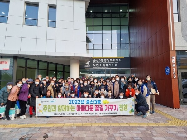 참여자들은 쌀쌀한 날씨에도 불구하고 송산3동의 올해의 마지막 아름다운 꽃길 조성을 위해 초화류를 식재하고 일대의 잡초를 제거하는 등 마을환경 정비를 위해 구슬땀을 흘렸다.
