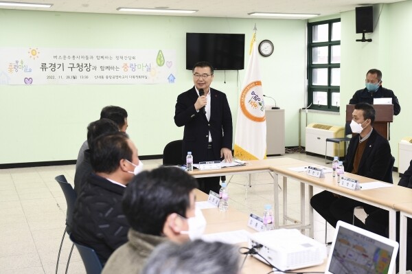 마실에는 류경기 중랑구청장과 중랑공영차고지 입주 운수업체 운수종사자 13명이 참석한 가운데 구의 대중교통 정책에 대한 의견을 나누고 현장의 고충을 들으며 해결 방안 모색하는 자리로 꾸려졌다.