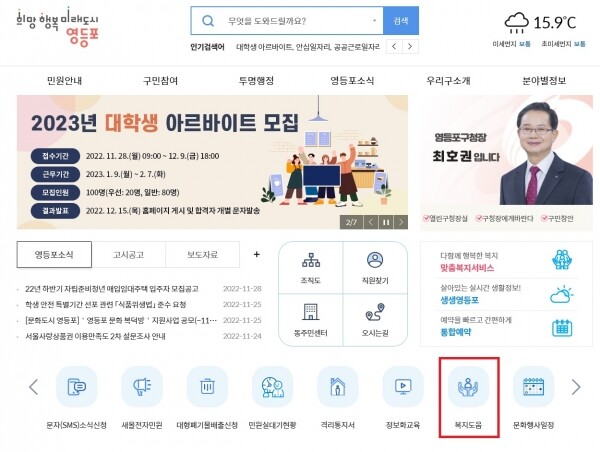 최봉순 복지정책과장은 “복지도움 신청 게시판을 통해 위기에 처한 은둔형 복지 사각지대를 발굴하는 데 적극적으로 노력해 나가겠다”며 “도움의 손길이 필요한 분들은 지체 없이 ‘복지도움 신청’ 게시판으로 신고해 주시길 바란다”고 전했다.