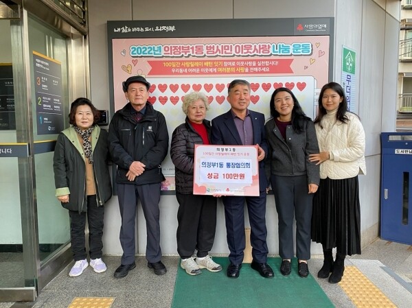 의정부1동 통장협의회는 평소 시정 홍보, 환경정화 활동, 복지사각지대 발굴 등 지역사회 발전을 위해 헌신적으로 활동하는 모범적인 자생단체로 매년 100일간 사랑릴레이 배턴 잇기에 참여해 기부활동을 이어 나가고 있으며 주변에 기부문화를 적극적으로 홍보해 나눔문화 확산에도 기여하고 있다.