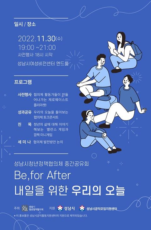 시 관계자는 “올해 첫 발을 내딛은 ‘성남시 청년정책협의체’의 지난 활동들을 돌이켜보고 앞으로의 비전을 만들어나가는 자리”며 “성남시 청년 거버넌스의 발전을 위해 성남시민들의 관심과 응원을 당부드린다”고 했다.