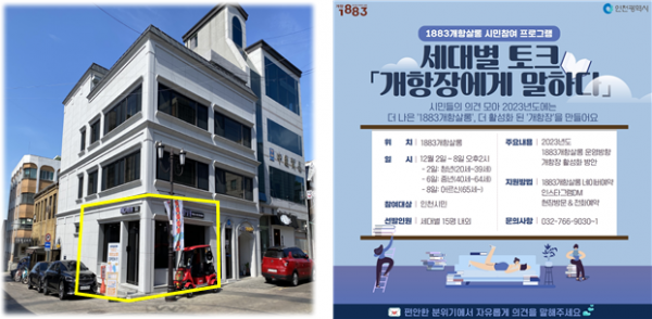 1883개항살롱은 인천시 제물포르네상스기획단에서 직접 운영하는 개항장&내항 현장지원센터로 올해 어르신 함께 가요 19세기 제물포 가을마실 개항장 지역전문가 양성 교육 개항장 활성화 네트워크 운영 원데이클래스 SNS 유튜브계정 운영 등 시민들과 함께 소통할 수 있는 다양한 프로그램을 진행했다.