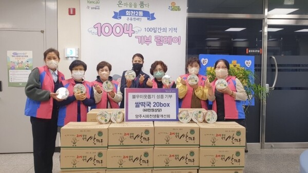 홍미영 회천2동장은“어려운 경제상황에도 지역 내 소외된 이웃을 위해 기부에 참여해 주신 양주시 생활개선연합회 회천생활개선회 이경희 회장님과 회원들의 따뜻한 사랑과 성원에 감사드린다”고 전했다.