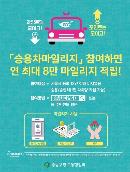 류경기 중랑구청장은 “승용차마일리지 사업에 적극적으로 동참해 주신 구민분들 덕분에 이번 평가에서 최우수구로 선정될 수 있었다”며 “환경도 지키고 다양한 혜택도 얻어 갈 수 있는 승용차마일리지 사업에 지속적인 관심을 부탁드린다”고 말했다.