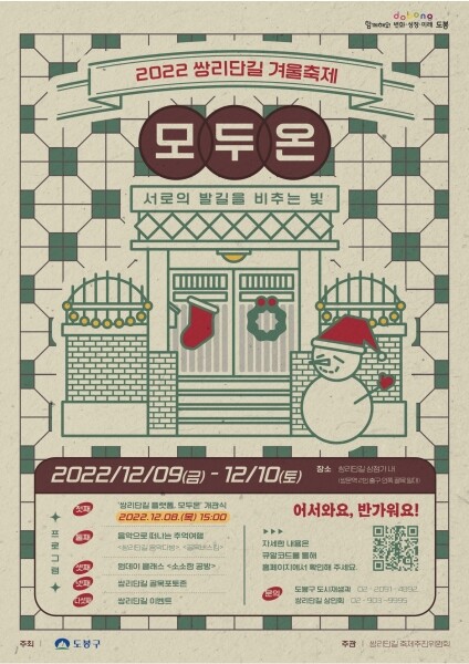 ‘쌍리단길 플랫폼, 모두온’ 개관을 축하하기 위한 겨울 이벤트 ‘모두온’도 9일 10일 쌍리단길 상점가 곳곳에서 열린다.