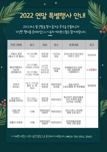 주요 행사 내용은 인형극 공연, 메이커클래스, 재능기부자 스토리텔링, 독서퀴즈~ 정답을 찾아라 소망나무 꾸미기, 독서대출자 이벤트 등이다.