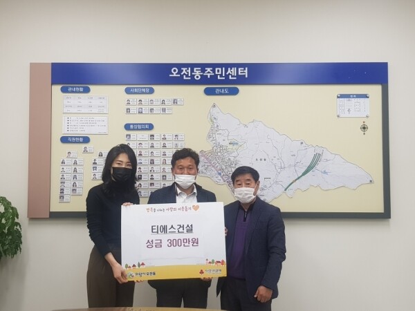 정유헌 오전동장은 “모두가 어려움을 겪고 있는 시기에 따뜻한 마음을 담아 매년 성금을 기탁해주신 티에스건설 강필구 대표님께 감사드리며 후원해 주신 성금은 관내 취약계층 가구를 위해 잘 사용하도록 하겠다”고 말했다.