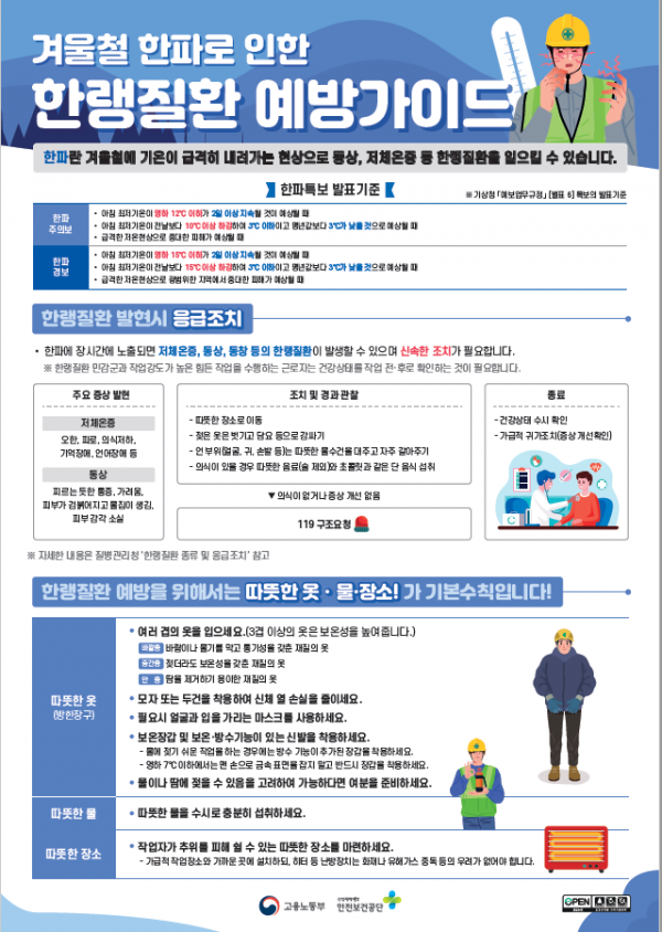 이에 따라 고용노동부는 범정부 차원의 ‘국가 재난체계 구축·가동 매뉴얼’에 맞추어 겨울철 재해예방을 위한 한파대책 기간을 운영하고 취약업종을 중심으로 유관기관과 협업해 “한랭질환 예방가이드”를 마련해 적극 알리고 또한 각 사업장에 대한 이행점검도 강화할 방침이다.