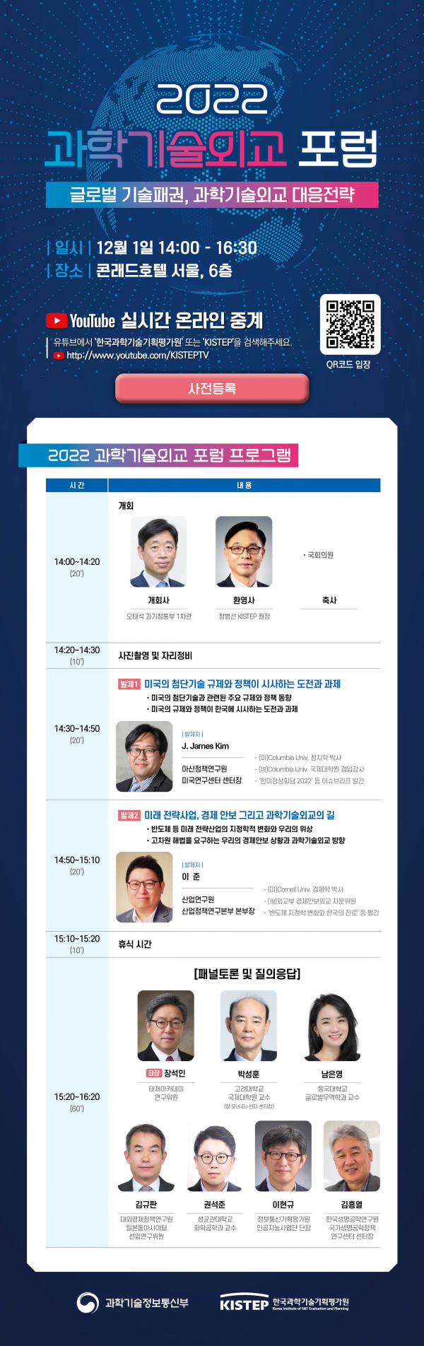 ‘혁신적 포용국가를 위한 과학기술외교 전략’의 주요 과제세 번째로 열리는 금번 2022 과학기술외교 포럼은 최근에 떠오르는 이슈로 미국의 첨단기술 규제 정책과 중국, 일본, 유럽연합 등 세계 각 국의 첨단기술·전략산업 확보 경쟁에 대한 대응전략을 논의한다.