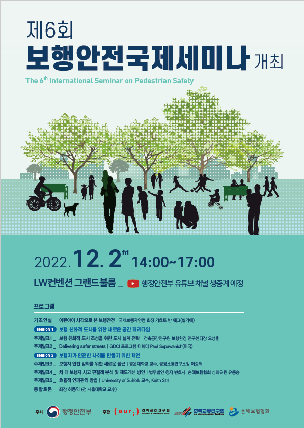 올해 보행안전 국제 토론회의 주제는 ‘걷기 좋고 안전한 보행도시 만들기’로 보행환경 개선을 위해 국내·외 우수사례를 소개하고 정보 공유의 장을 마련하기 위해 개최하게 됐다.