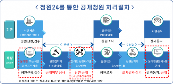 온라인 청원신청 서비스 개통으로 누구나 인터넷을 통해 청원을 신청·접수할 수 있게 되며 다양한 국민 의견을 수렴할 수 있는 ‘공개청원’서비스도 함께 시행된다.