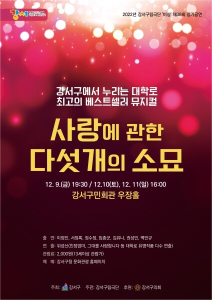 구 관계자는 “코로나19로 인해 3년 만에 다시 무대에 선 강서구립극단이 따뜻한 겨울을 선물하기 위해 대학로 최고의 뮤지컬 공연을 심혈을 기울여 준비했다”며 “남녀노소 공감할 수 있는 사랑 이야기로 가족과 연인들이 일상의 스트레스를 날리는 시간이 되기를 바란다”고 말했다.