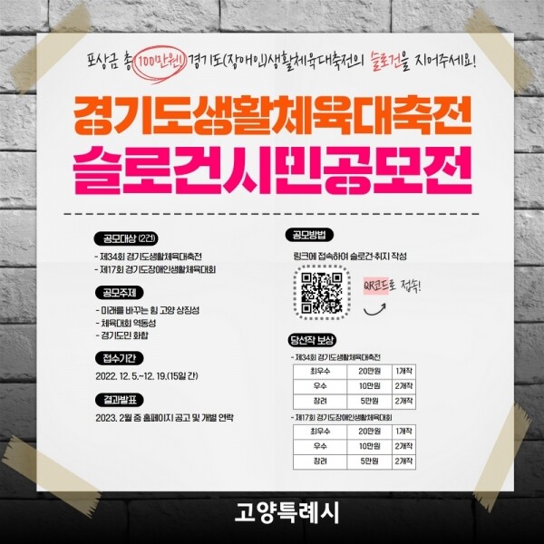 시 관계자는 “당선작은 2023년 경기도생활체육대축전 슬로건으로 사용된다 대회의 의미를 잘 보여줄 수 있는 좋은 작품이 나올 수 있도록 많은 관심과 참여 부탁드린다”고 전했다.