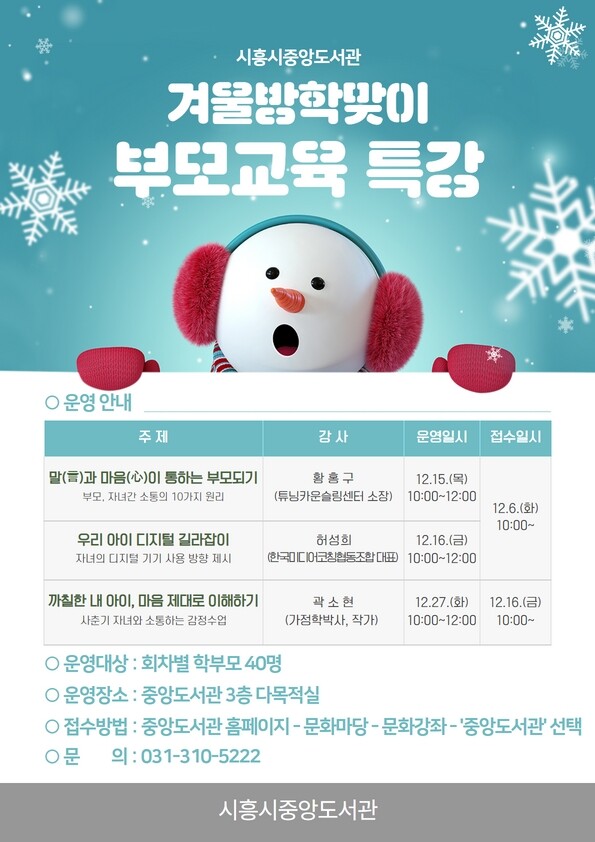 이어 16일에는 겨울방학동안 스마트폰 사용 문제로 사춘기 자녀와 실랑이를 벌일 학부모들을 위해 한국미디어코칭협동조합 대표이자, 한국언론진흥재단 미디어 강사로 활동 중인 허성희 강사의 ‘우리 아이 디지털 길라잡이’ 강의가 운영된다.