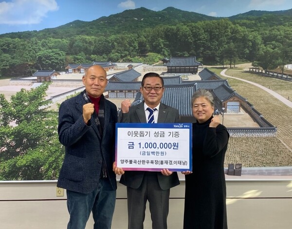 권순용 광적면장은“3년째 잊지 않고 따뜻한 기부를 실천해주시는 양주불곡산한우목장에 진심으로 감사드린다”며“찬 바람이 부는 어려운 시기에 홍재경, 이태남 대표의 선한 영향력이 널리 확산되길 기대한다”고 말했다.